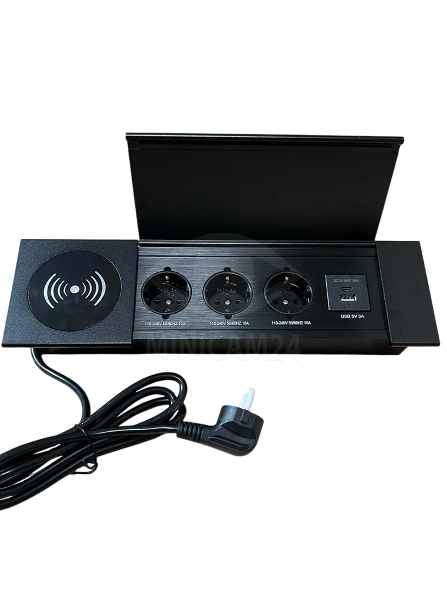 Встраиваемый блок розеток в столешницу DeskOn S3, 3 розетки, USB-A, USB-C, беспроводная зарядка